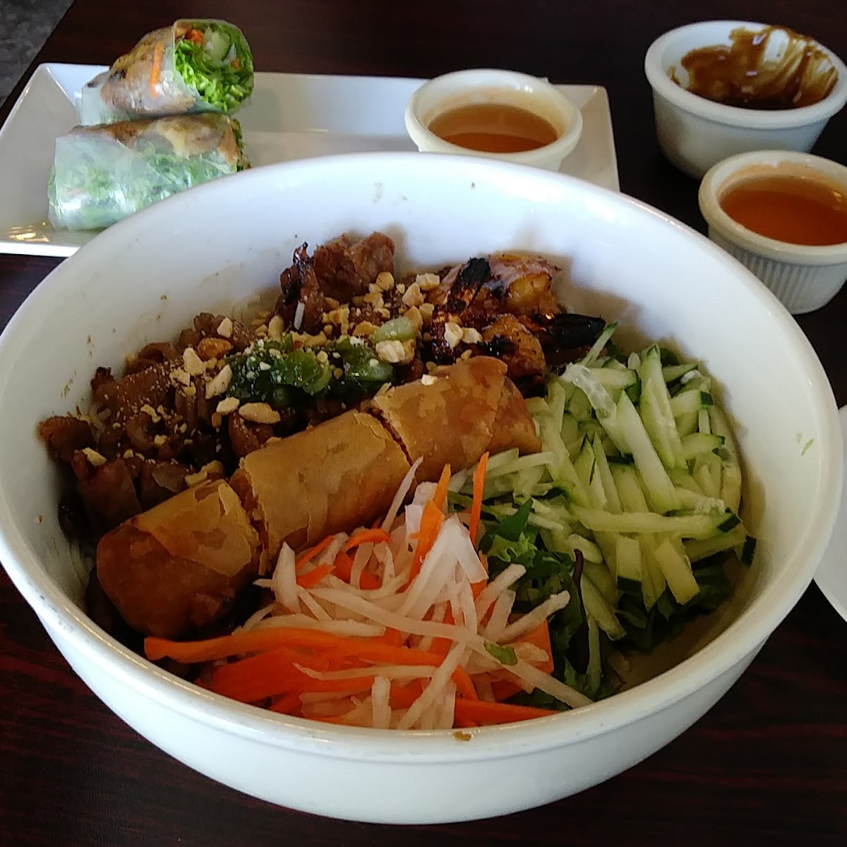 Parking is fairly straightforward in the plaza lot, which adds to the convenience for those visiting during lunch hours or early evenings. Dishes like the special pho dac biet and the rich bò chảo (pan-seared beef) stand out for diners looking to try something beyond the usual pho bowl. The signature winter bites with crispy eggrolls drizzled in house sauce show the kitchen’s willingness to reimagine common Vietnamese appetizers without losing authenticity.